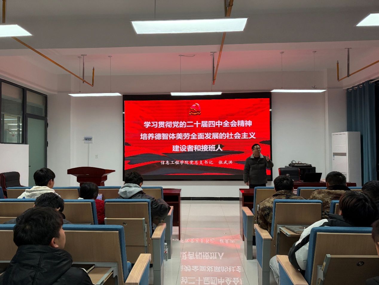 为进一步加强入党积极分子培养教育,引导广大青年学生坚定理想信念,12月30日晚上,澳门十大网投平台排行党总支书记张武洪在数字信息实训大楼多功能报告厅205为110多名入党积极分子讲授了“学习贯彻党的二十届四中全会精神,培养德智体美劳全面发展的社会主义建设者和接班人”为主题的专题党课。