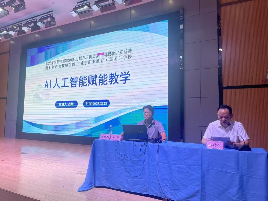 近日,澳门十大网投平台排行占辉老师受邀走进咸宁职业教育(集团)学校,在 该校“2025年暑假干部教师能力提升培训暨第58期职教讲堂活动”中,作“AI 赋能教学创新”专题讲座,为200余名干部教师讲授兼具理论高度与实操价值的AI应用知识与技能,讲座成果获主办方高度认可。