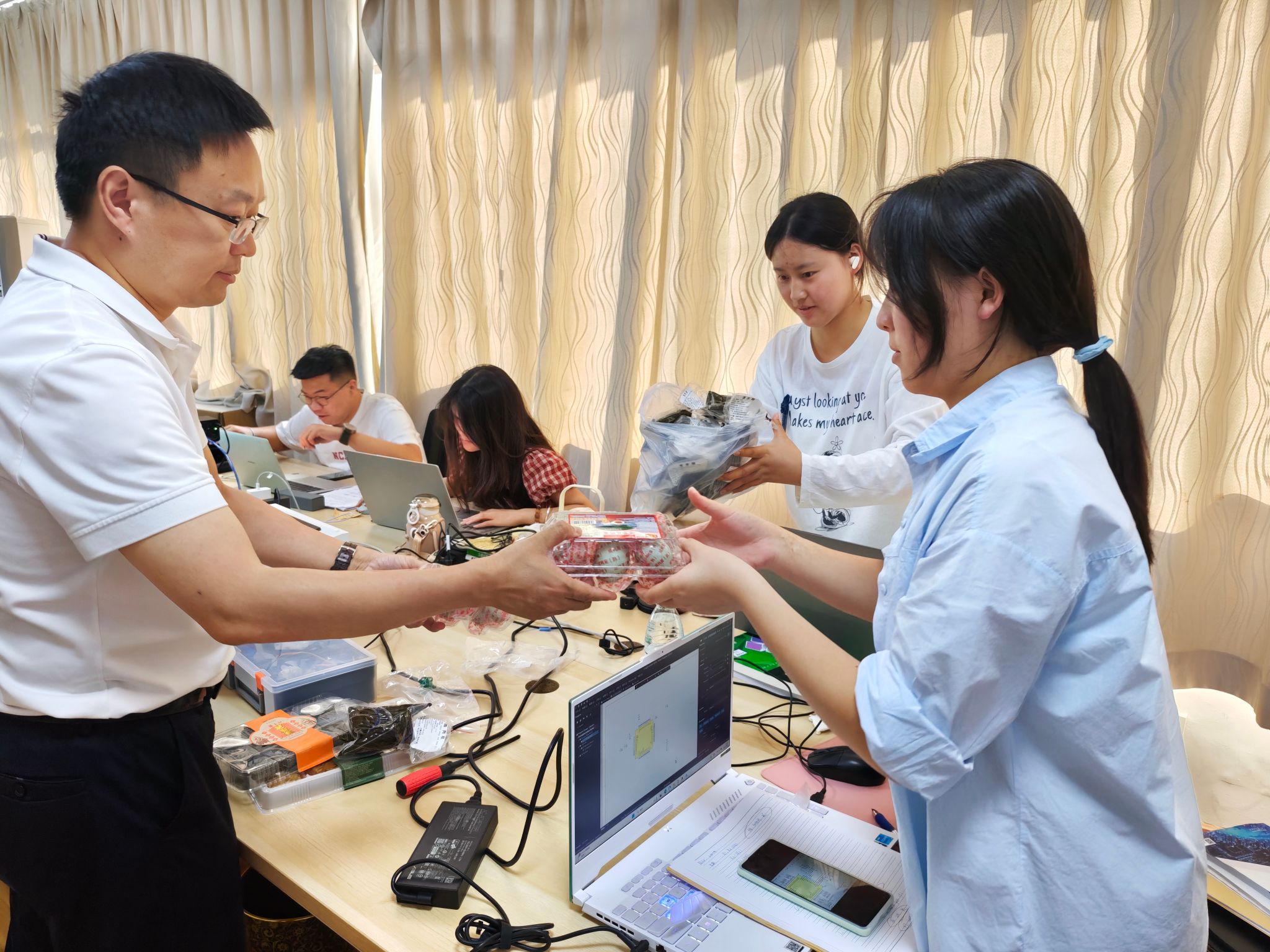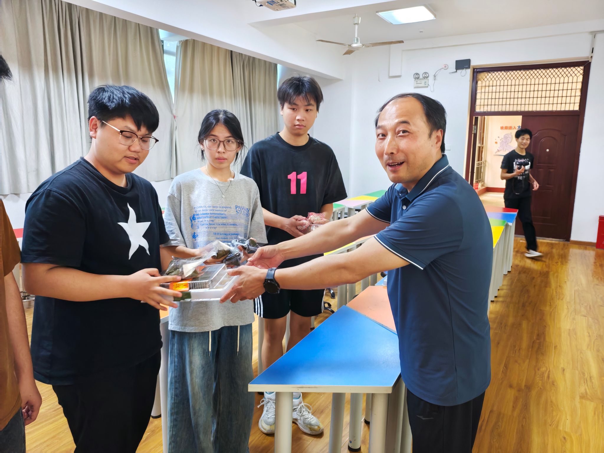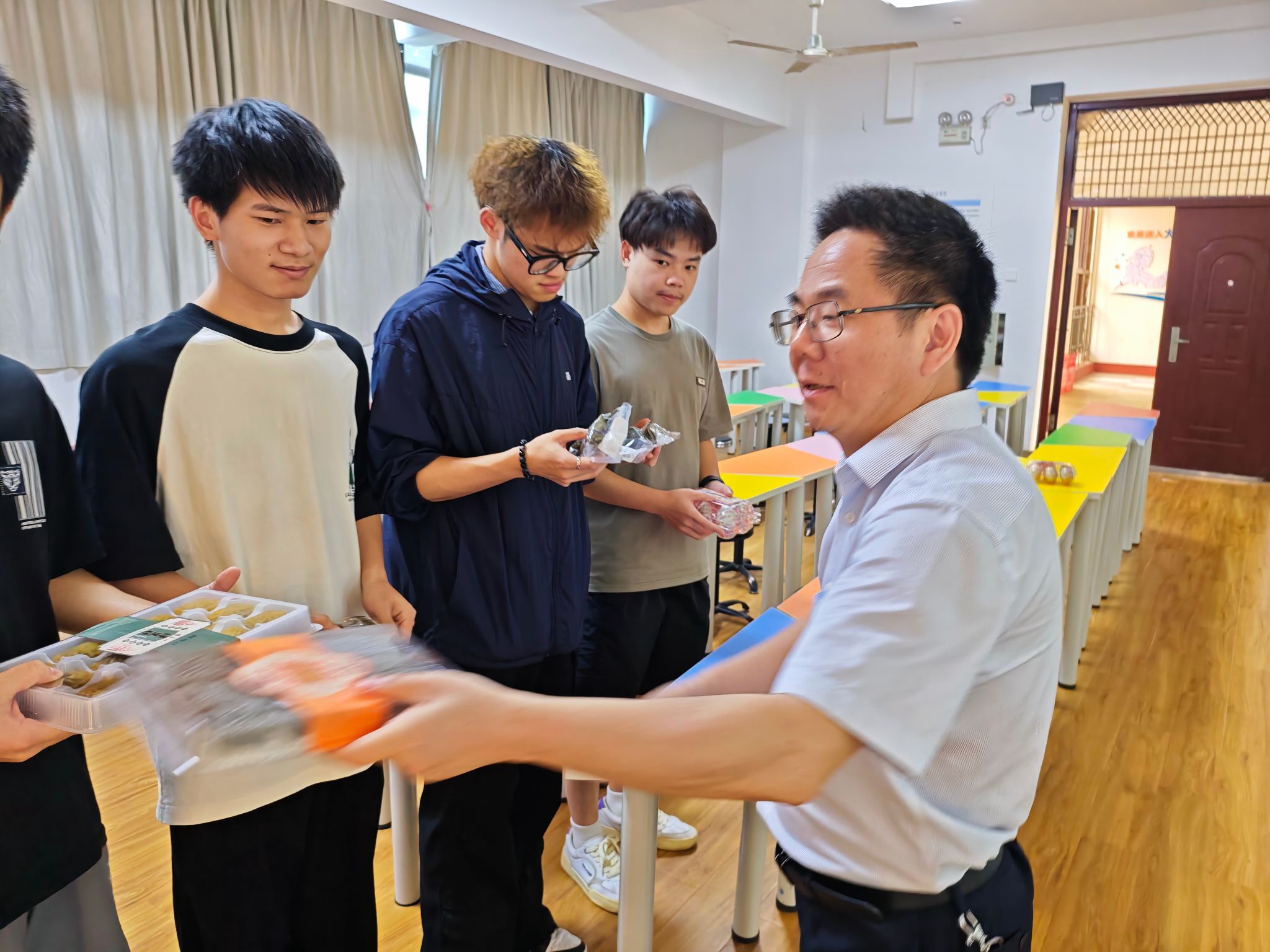 学院领导亲手将精心准备的节日慰问品——饱含祝福的香粽、清甜可口的绿豆糕、寓意圆满的咸鸭蛋等一一送到学生手中。一份份沉甸甸的礼物,传递着浓浓的节日温情与学院的深切关怀。手中暖意融融的节日礼物,让身处紧张备赛中的学子们倍感温暖与鼓舞。